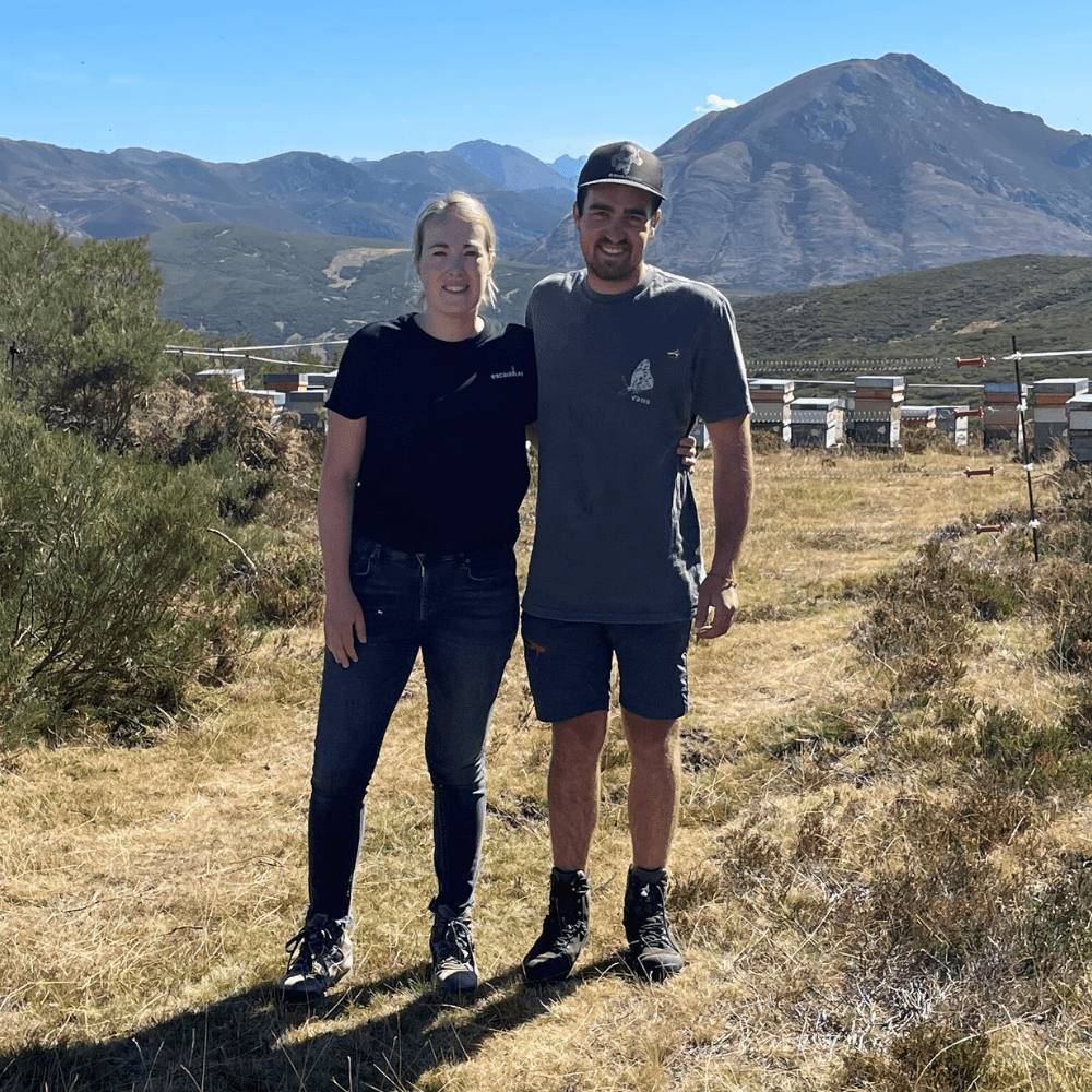 Beekeepers Olaya and Mario with multiple hives in mountainous area of Asturias, a region in north-west Spain