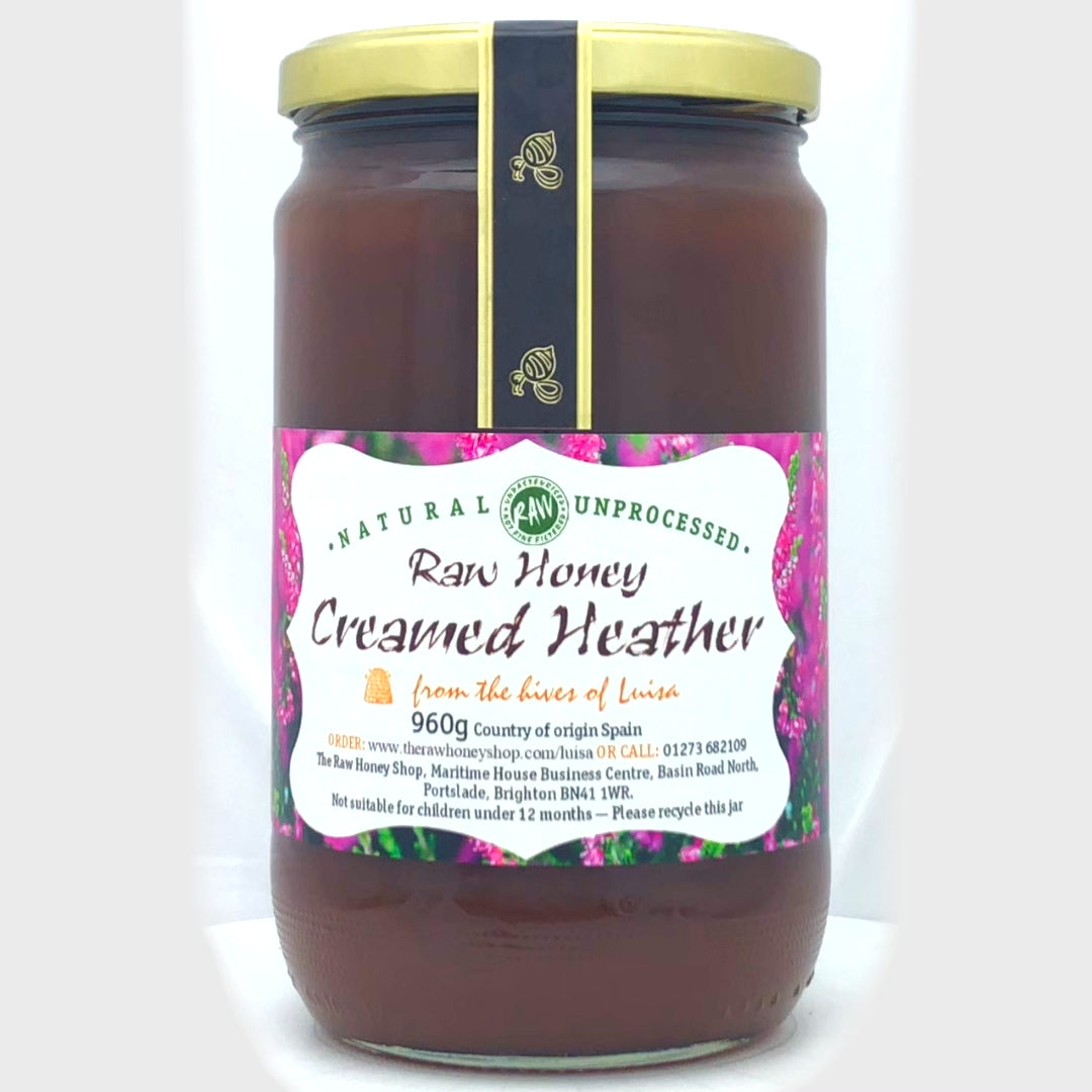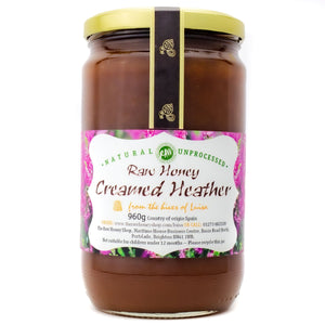 Large labelled glass jar containing 960g of dark raw creamed heather honey.