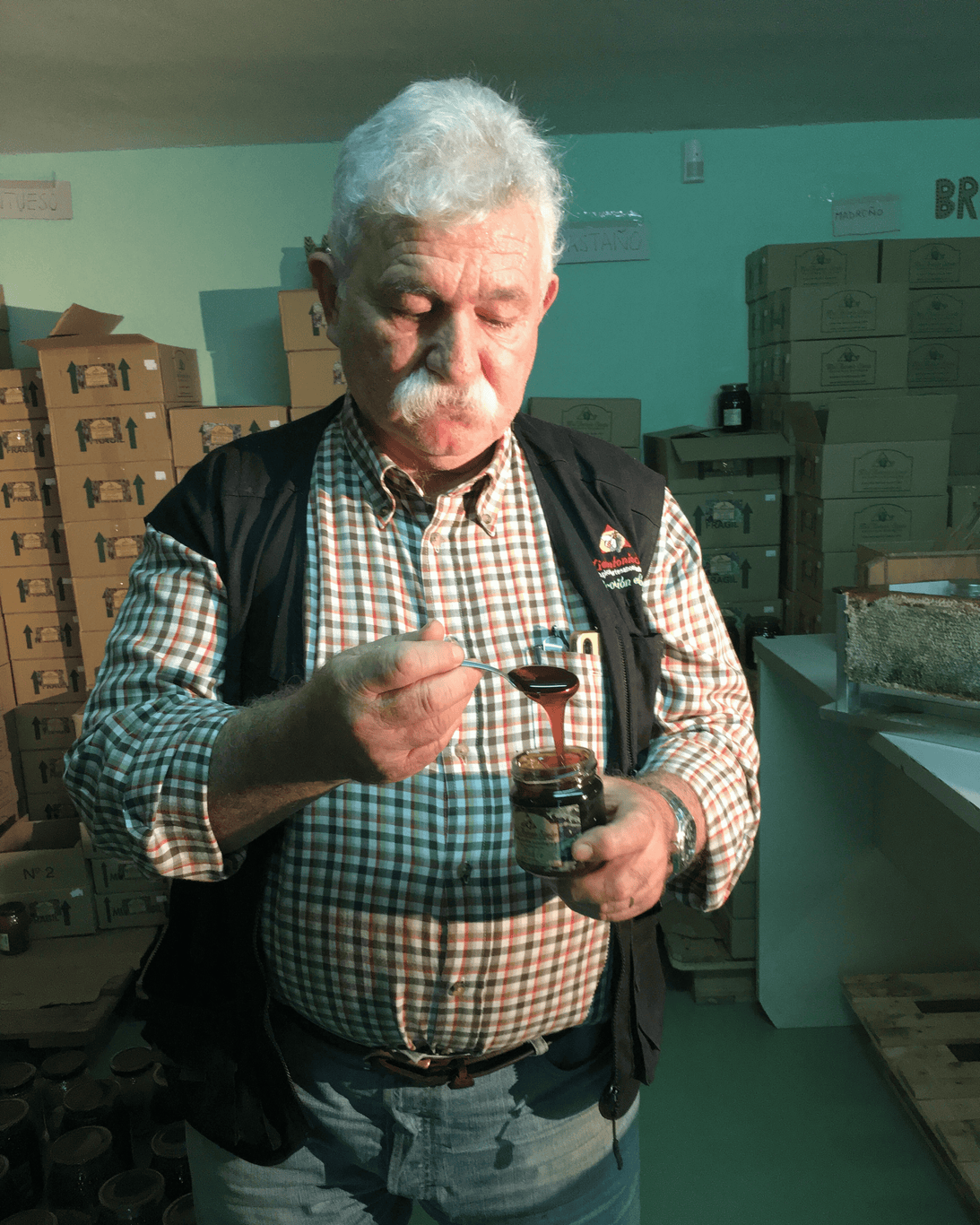 Wer produziert den Honig? Die Bienen von Antonio Simon, einem Imkerin der vierten Generation, der stolz darauf ist, Honig auf traditionelle Weise zu produzieren, ohne etwas hinzuzufügen oder wegzunehmen. Antonios Bienenstöcke befinden sich hauptsächlich in den Bergketten nördlich von Madrid.