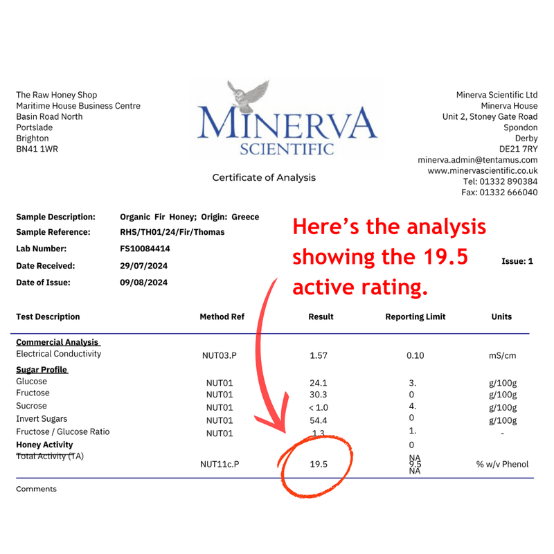 - Wir haben diese Partie Rottannenhonig im Labor testen lassen und das Ergebnis war ein hoher Aktivitätswert von 19,5.