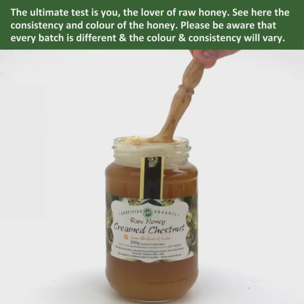 Luisas roher, cremiger Bio-Kastanienhonig hat tiefe, vollmundige, leicht rauchige, erdige Töne, die einen würzigeren Geschmack ergeben als die meisten anderen Honige. Er hat einen leicht bitteren Geschmack. Er hat Karamellnoten, die sich um eine Essenz von tiefen, schwarzen Rosinen und Pflaumen drehen und ein leicht eisenhaltiges Prickeln auf der Zunge hinterlassen.