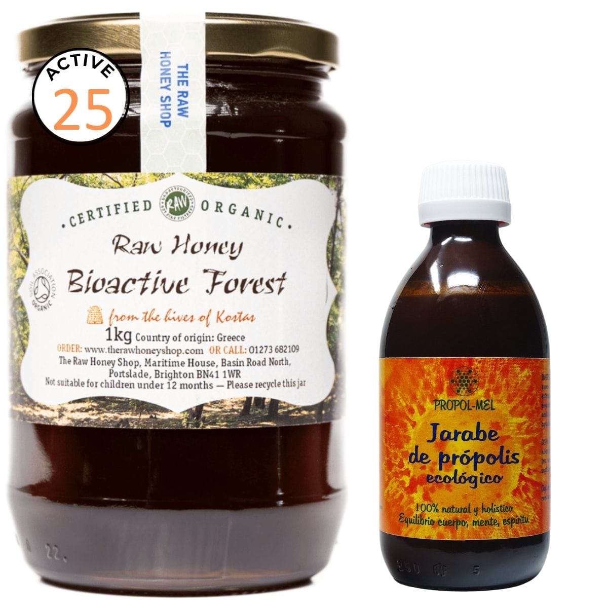 Winter Throat & Cough Defence Set - 1kg jar of Antibacterial Forest Honey + All Natural Honey & Propolis Throat Syrup