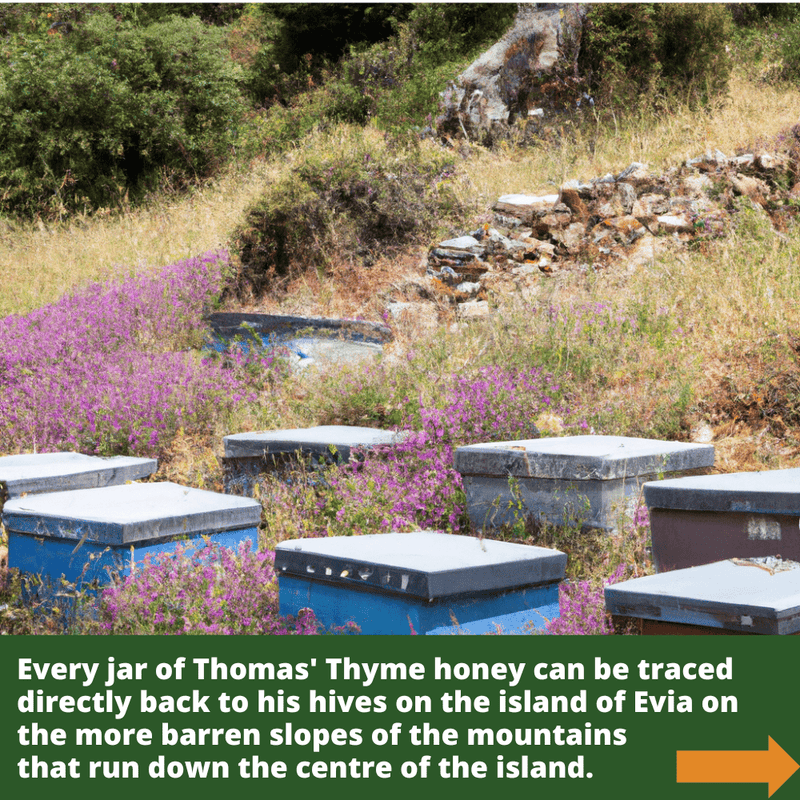 D'où vient le miel ? Cette variété de miel de thym provient des montagnes de l'île d' Eubée, sur les pentes les plus arides des montagnes qui s'étendent au centre de l'île.
