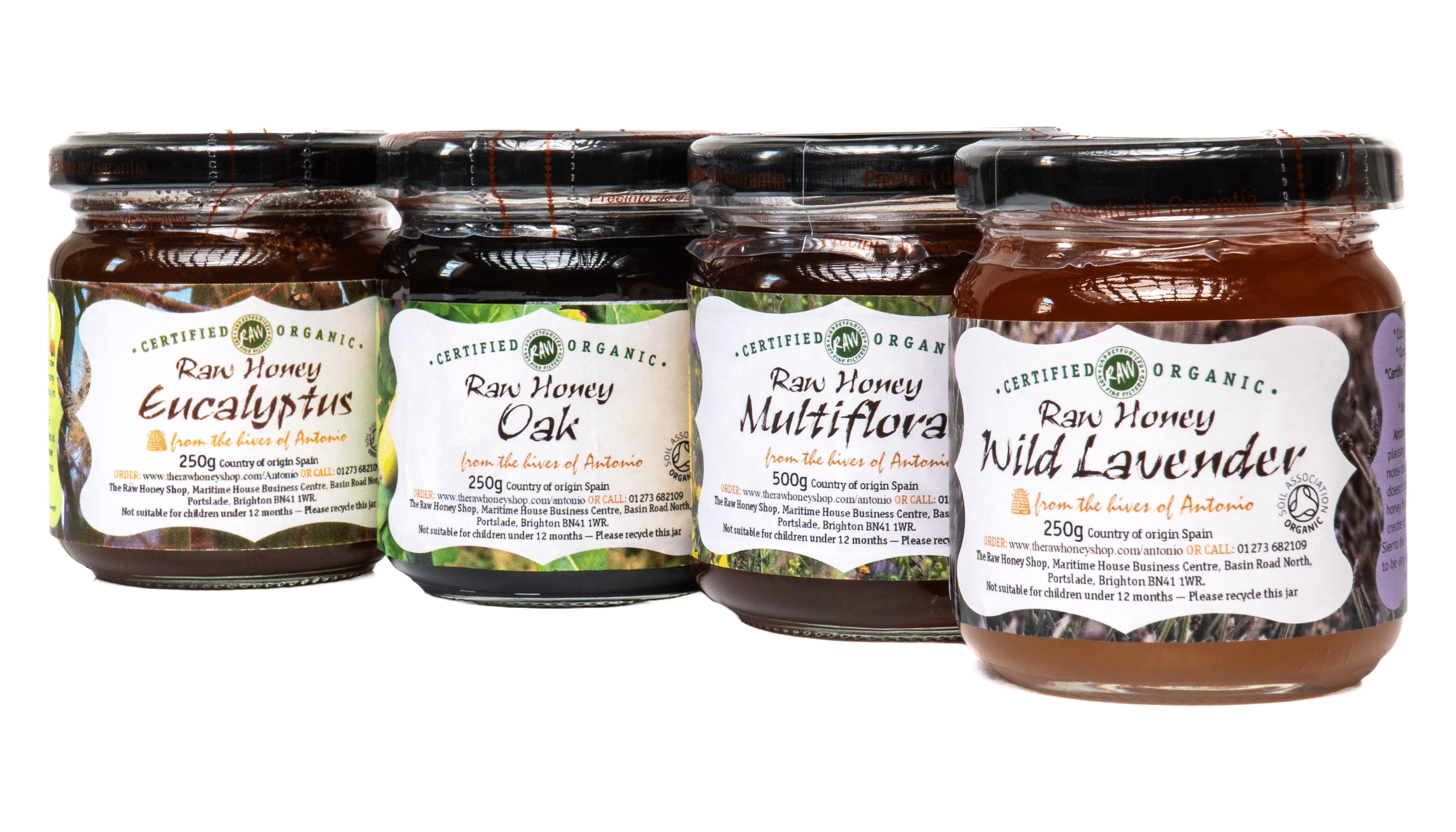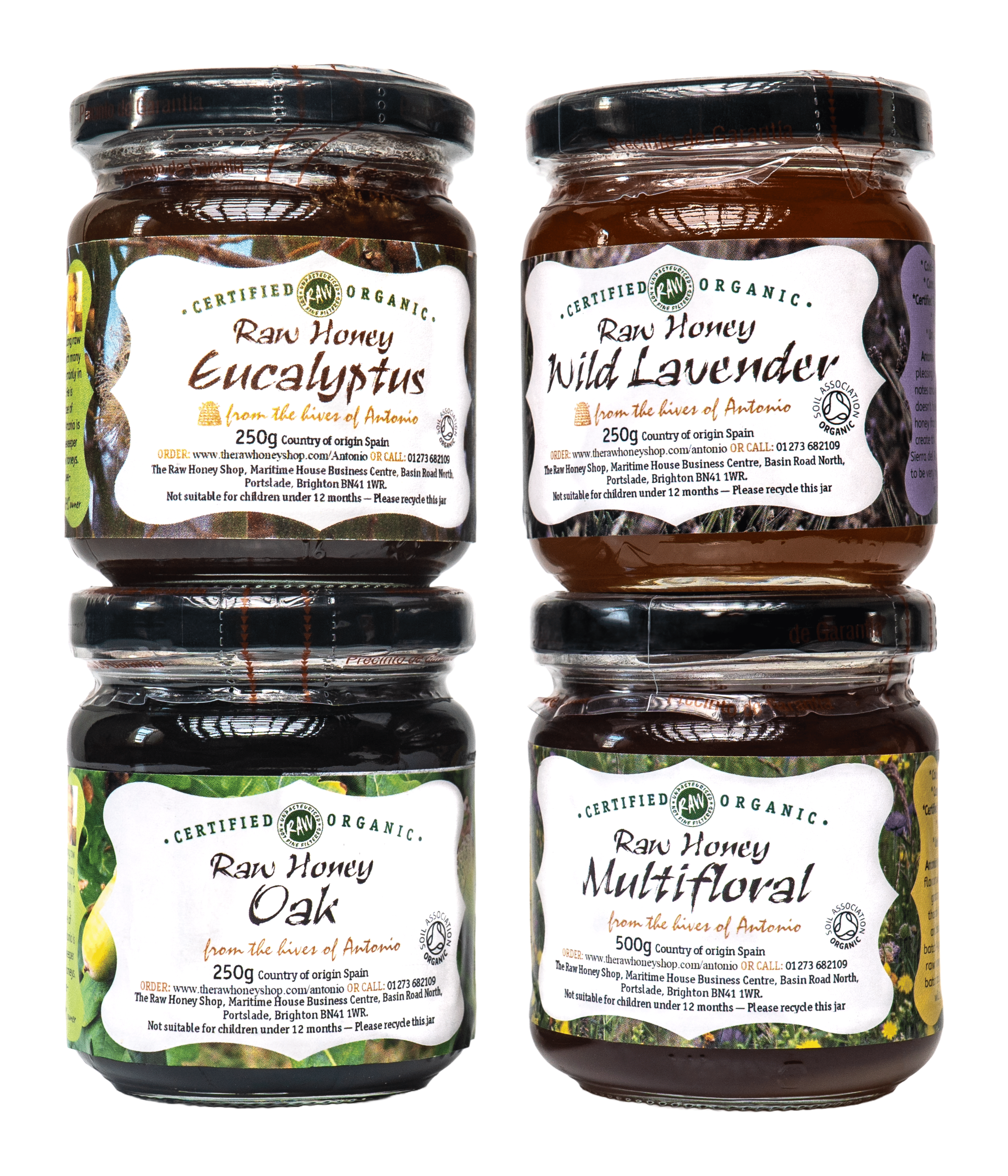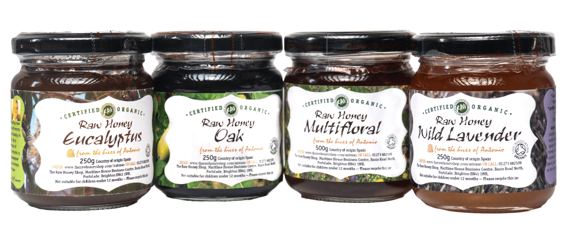 A selection of 4 of our best selling organic honeys from 4th generation beekeeper Antonio