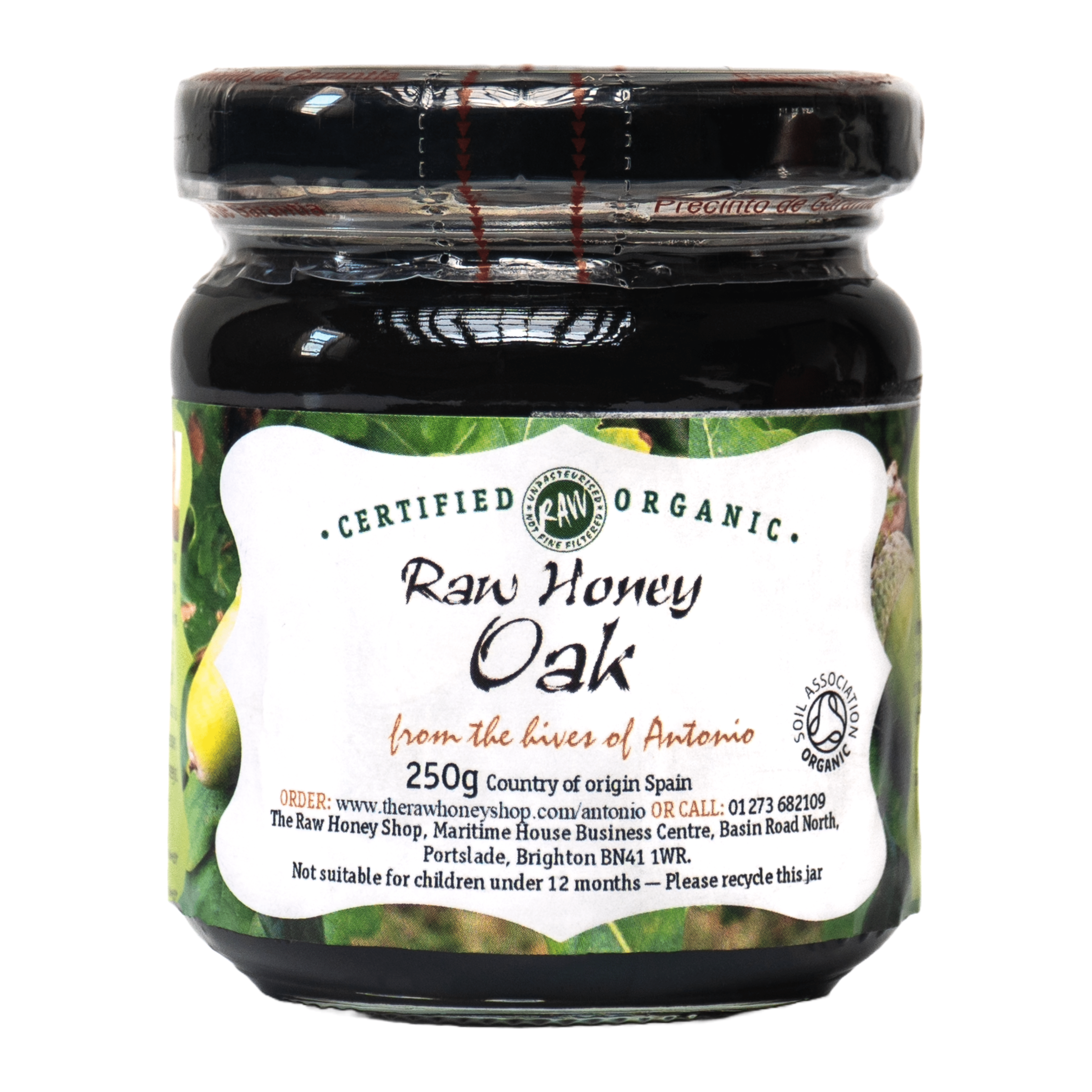 Most Oak honey comes from the acorns of the oak tree. The bees collect a sweet fluid that the acorns weep in July and August and from this the bees create a unique type of honey. Other types of tree honey are produced solely from the residue left by the activity of aphids on trees - but this is not the case with the oak honey. The bees directly collect the sweet fluid mainly from the acorns. It tends to be less sweet than other honeys and can be very potent.