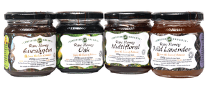 - Includes: 4 x 250g jars of Raw Organic Wild Lavender, Eucalyptus, Oak, and Multifloral honey.